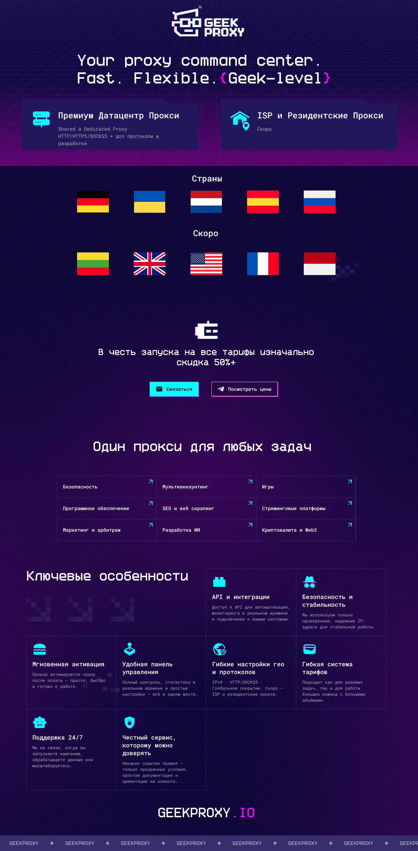 Запустили новый проект — GEEKPROXY.IO. Сейчас предлагаем датацентр-прокси IPv4, идёт публичный тест сервиса, поэтому цены ниже обычных.