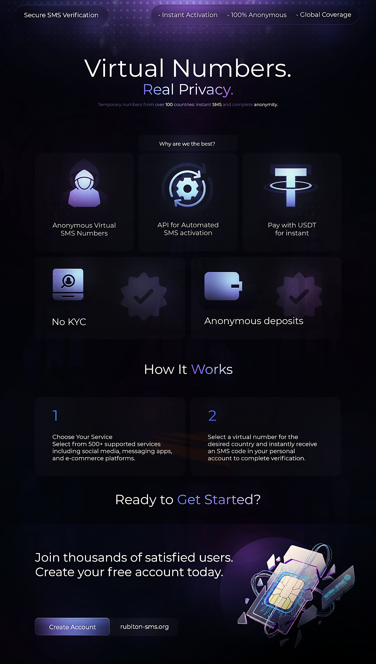 Rubiton SMS is a virtual number rental service for receiving SMS messages, designed for fast, anonymous and fully autonomous SMS verification.